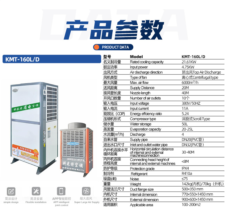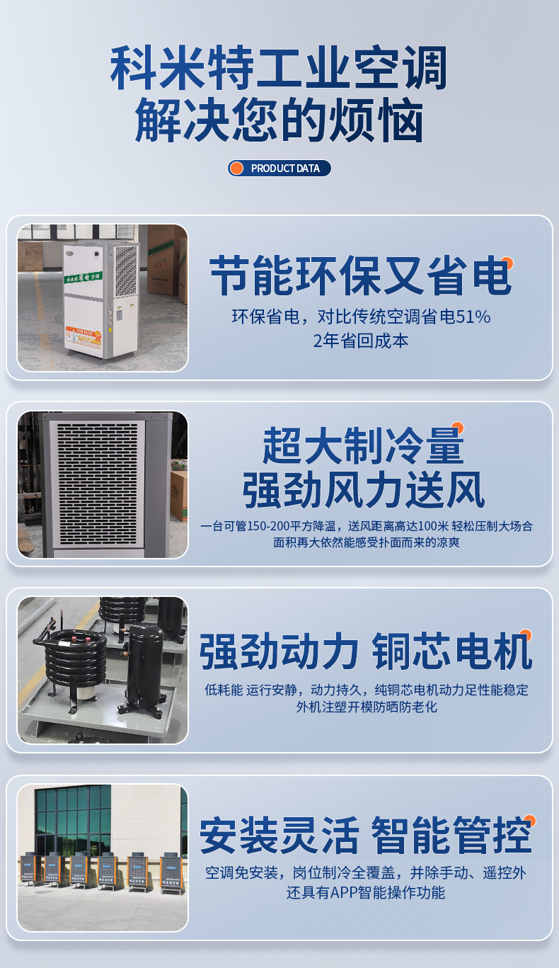 配置高性能离心风机,顶出风设计,可连接50米风管,岗位送风,精准降温,降温面积100-200平方。